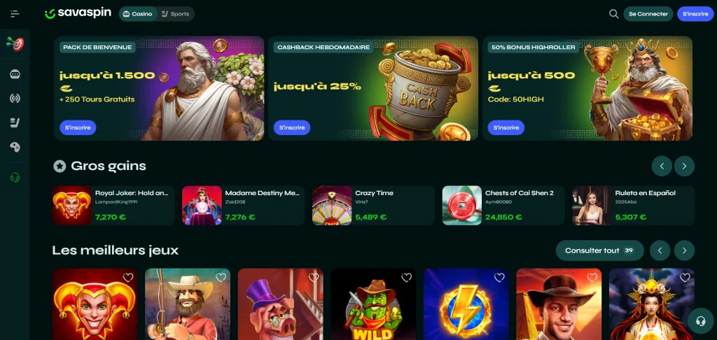 Le catalogue de Savaspin est particulièrement impressionnant en ce qui concerne les machines à sous à achat de bonus et les jeux de type « Crash ». C’est un casino dynamique, qui organise des tournois flash toutes les heures, permettant de gagner des prix sans avoir à jouer pendant des jours. Malgré sa jeunesse, Savaspin a déjà prouvé sa solidité financière et son engagement envers le jeu responsable. Pour les joueurs qui privilégient l’efficacité, la vitesse et les nouvelles technologies, Savaspin est actuellement l’une des options les plus excitantes du marché français.